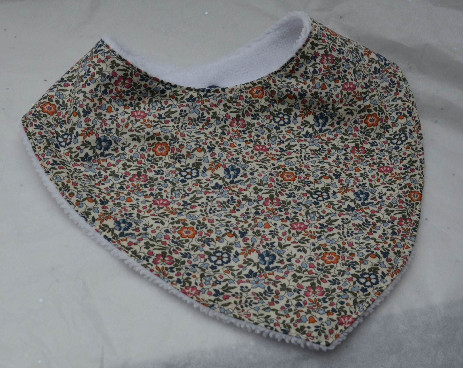 Ce bavoir est entièrement réalisé en France de manière artisanale. Il est en coton éponge blanche bambou toute douce doublé de coton Liberty Kattie and Millie automne dont le fond est très légèrement écru. Une pression marine ferme l'encolure. Il peut être posté directement à la personne à laquelle vous souhaitez l'offrir. (je peux y ajouter un message de votre part)