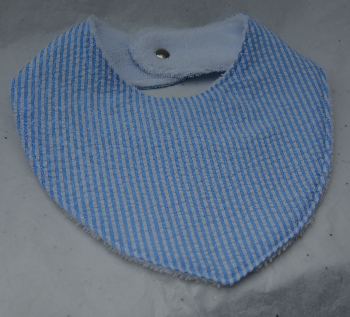 Ce bavoir est entièrement réalisé en France de manière artisanale. Il est en coton éponge blanche bambou toute douce doublé de coton et polyester seersucker bleu ciel et blanc. Une pression métallique ferme l'encolure. Il peut être posté directement à la personne à laquelle vous souhaitez l'offrir. (je peux y ajouter un message de votre part)